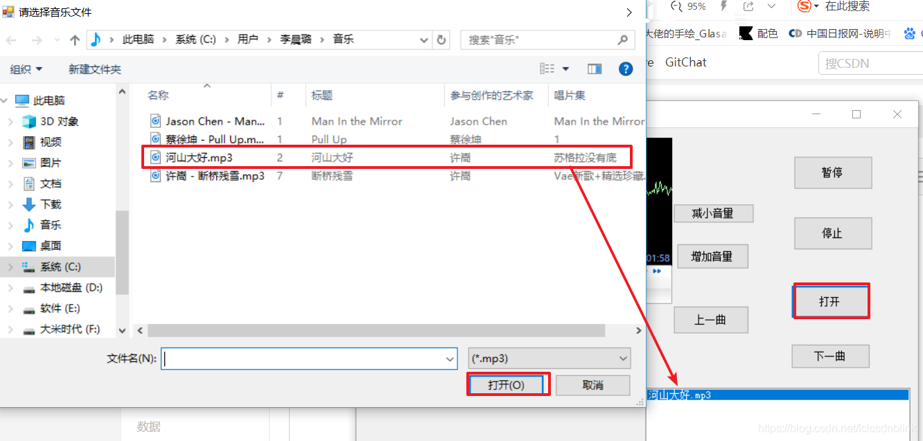 private void btnOpen_Click(object sender, EventArgs e) //打开按钮的功能 { //通过这个类我们打开文件 OpenFileDialog ofd = new OpenFileDialog(); //可以多选 ofd.Multiselect = true; //设置选择什么样的文件 ofd.Title = "请选择音乐文件"; //设置初始的目录 ofd.InitialDirectory = @"C:\Users\李晨璐\Music"; //设置显示文件的类型 ofd.Filter = "(*.mp3)|*.mp3"; //如果点了对话框的确定按钮 if(ofd.ShowDialog()==System.Windows.Forms.DialogResult.OK) { //获取选中的所有的歌曲的路径 string[] fileNames = ofd.FileNames; for(int i=0;i 3. 将歌词文件中的内容进行切割成以下的格式