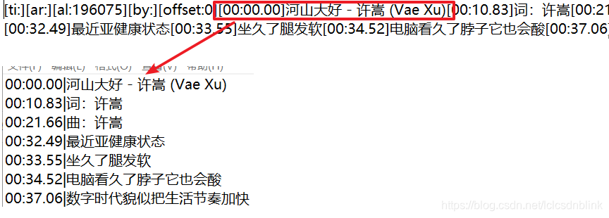 4.根据“|”左边的时间和当前音乐播放时间判断,可以算出一句歌词需要在哪个时间段播放,在显示出相应的歌词,就可以了(“|”右边)